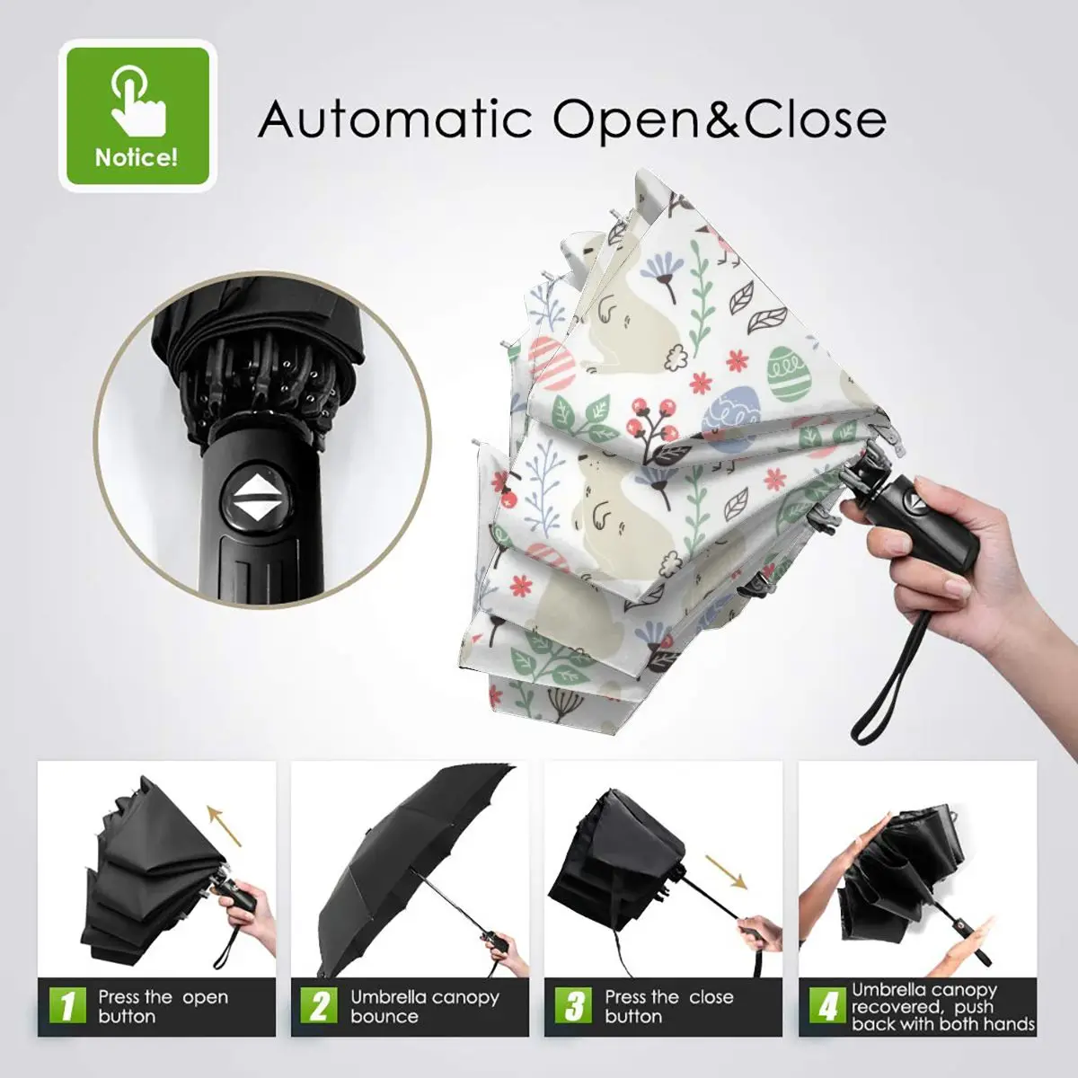 Product Name: Automatico Ombrello Da Pioggia Donne Tre-pieghevole Ombrello Fiori Conigli Uccelli E Uova Di Pasqua Antivento Impermeabile Parasole