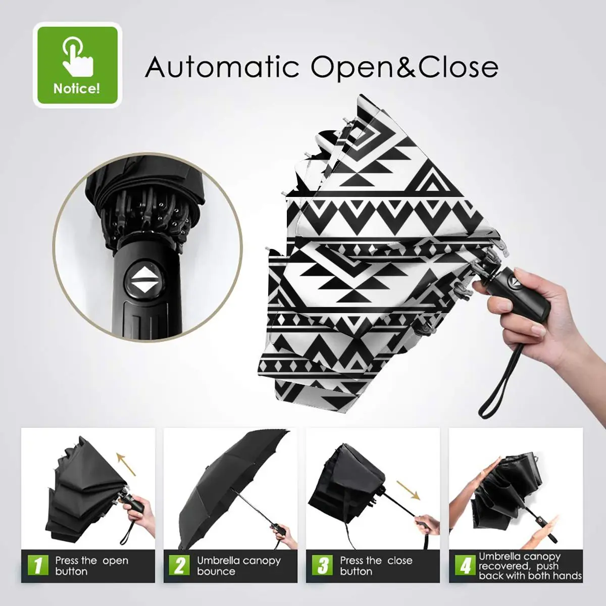 Product Name: Ombrello Soleggiato Bianco E Nero Tribale Automatico Pieghevole Portatile Uomo Donna Ombrello Protezione Solare Pioggia Antivento Ombrellone Da Spiaggia