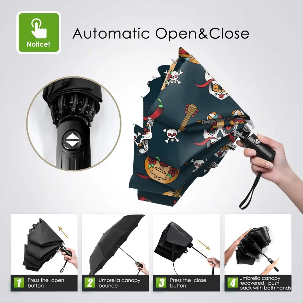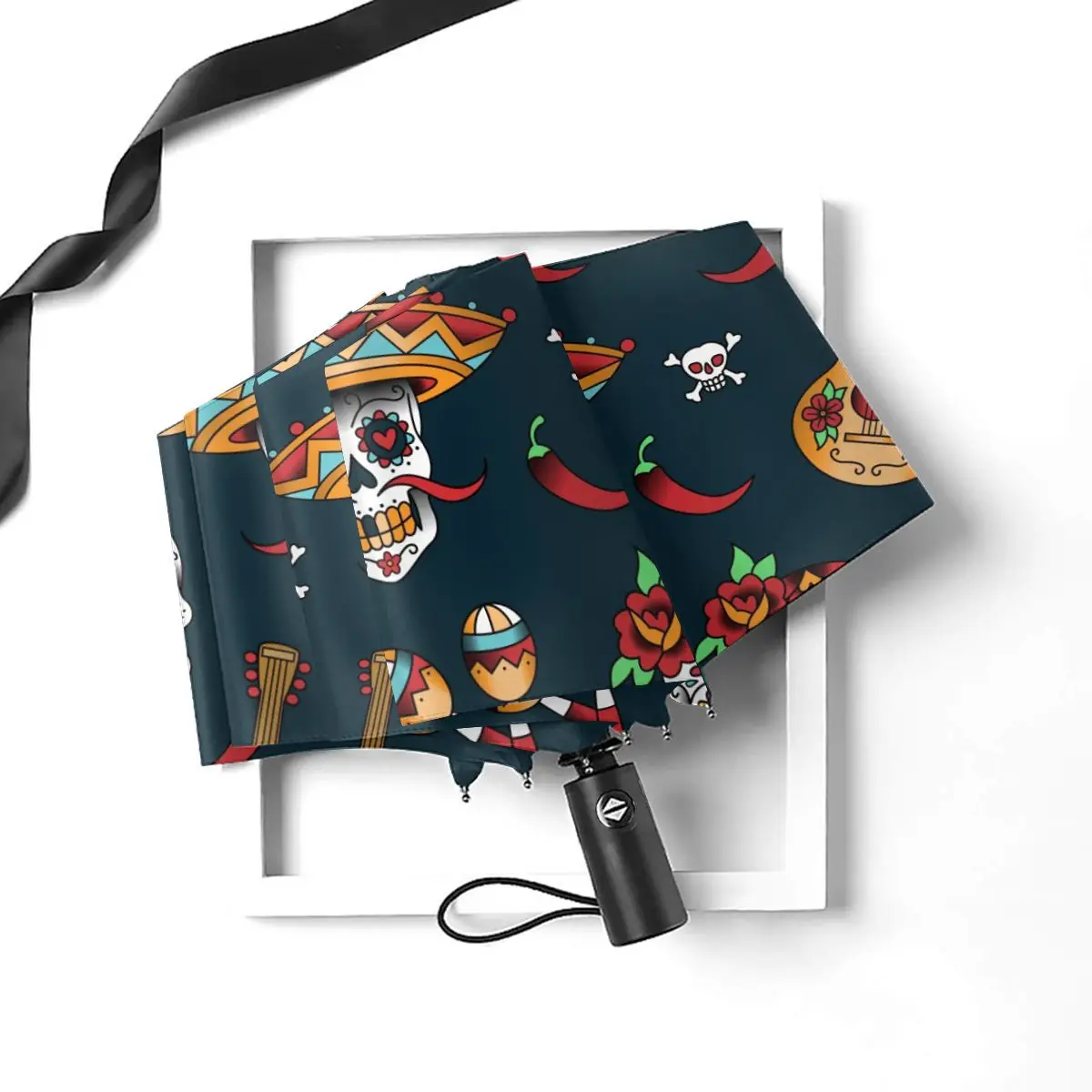 Product Name: Ombrello Automatico Pioggia Donna Ombrello A Tre Pieghe Modello Teschio Messicano Ombrello Antivento Ombrello Impermeabile Femminile